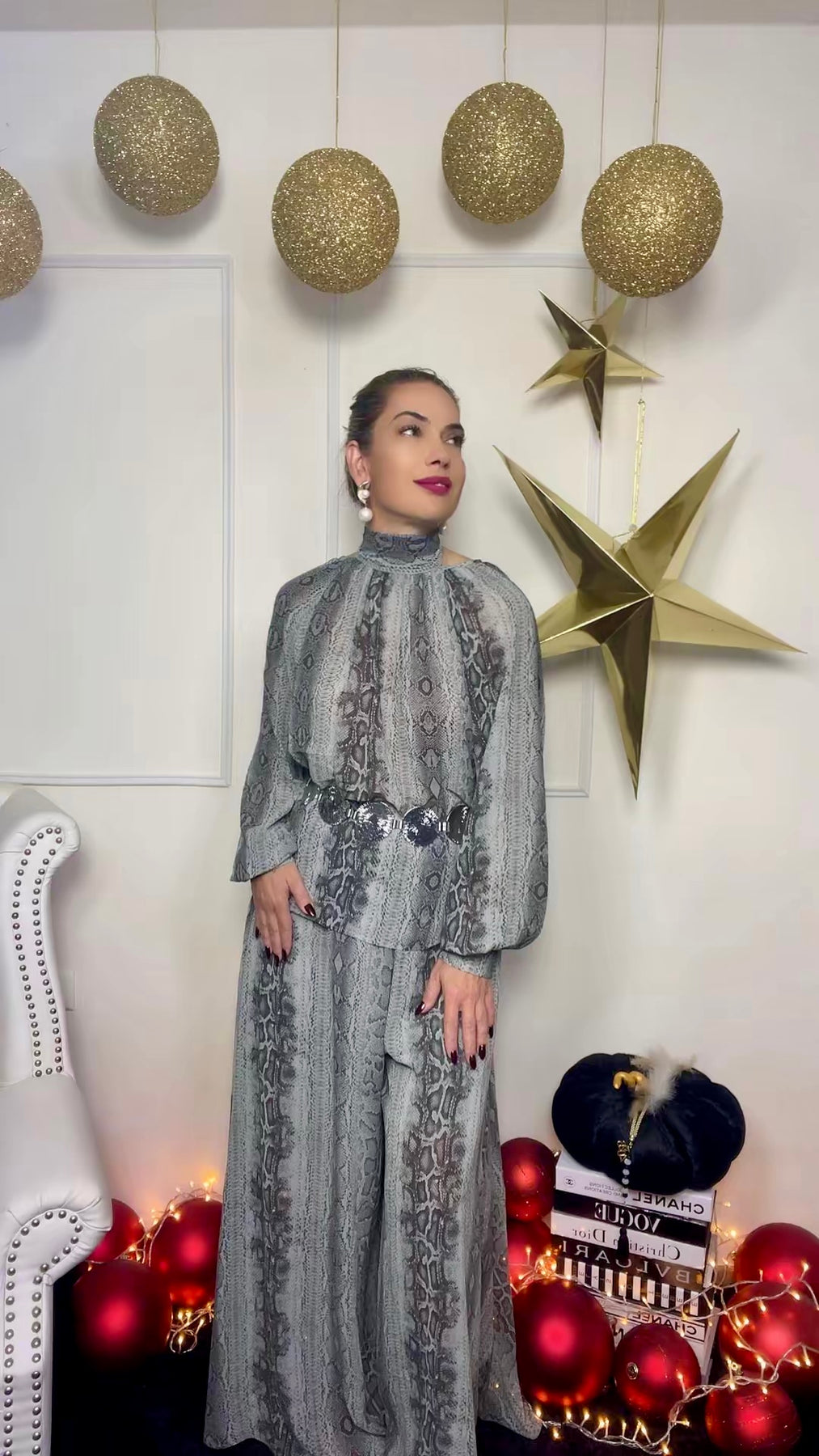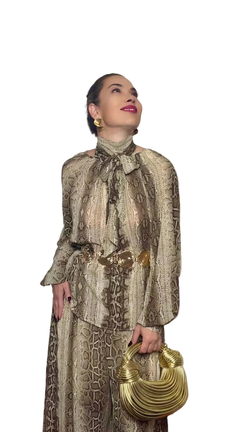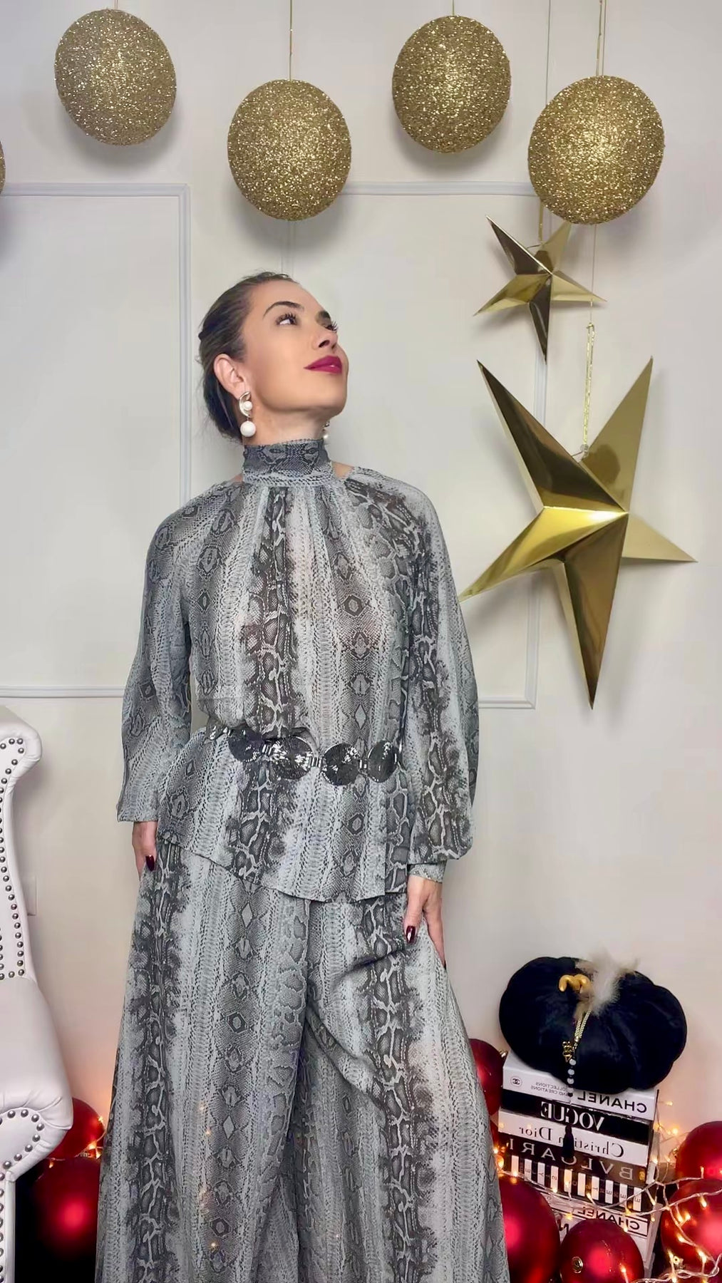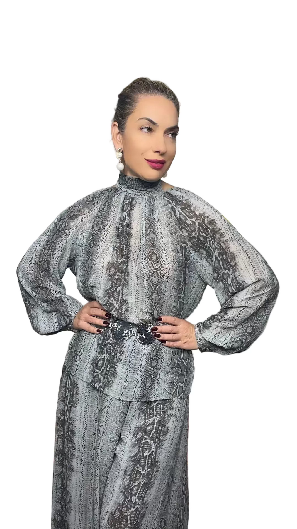 Κομψό και εντυπωσιακό γυναικείο σετ με snake print, ιδανικό για εμφανίσεις που ξεχωρίζουν από το πρωί έως το βράδυ.